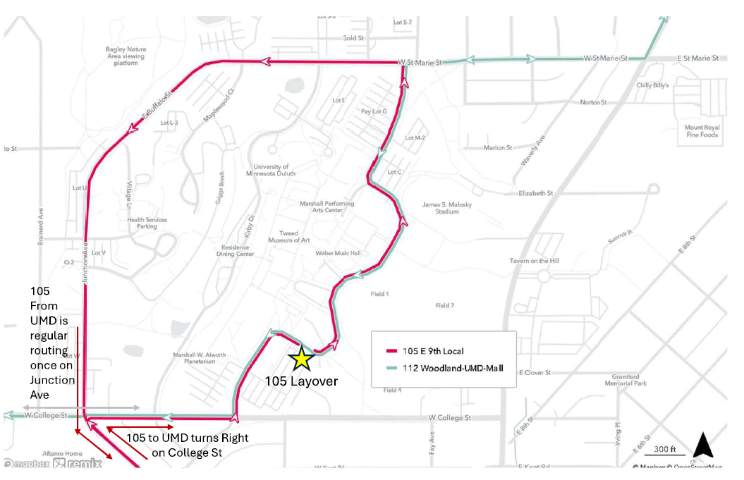 Route 105 To UMD: From 19th Ave East at College St turn right onto College St, follow College St to University Dr and turn left, follow University Dr until the temporary hub.
