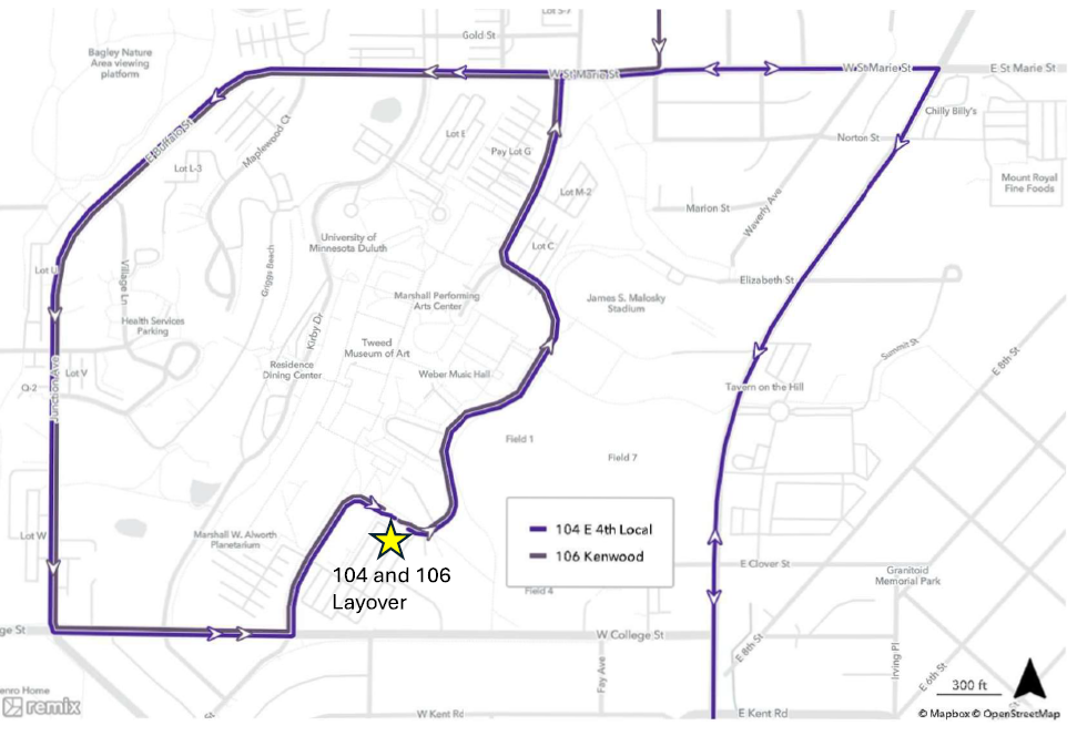 Routes 104 and 106 To UMD: From St. Marie St proceed past Kirby Dr and follow Junction Ave to College St and turn left, follow College St to University Dr and turn left, follow University Dr until the temporary hub.