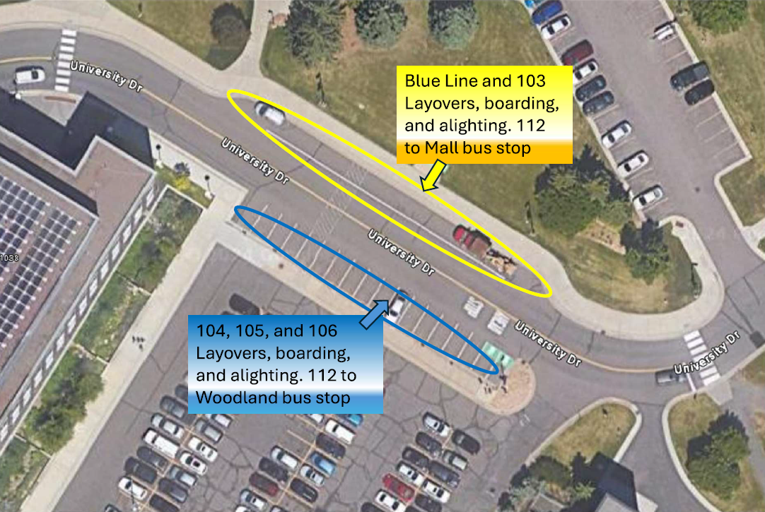 Routes 104 and 106 To Downtown: From the temporary hub follow University Dr to St. Marie St and turn right onto St. Marie St to regular route.